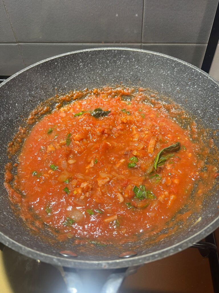 En otra sartén, cocina el guanciale a fuego medio sin añadir aceite hasta que esté dorado y crujiente. Una vez listo, intégralo en la salsa de tomate y mezcla bien.